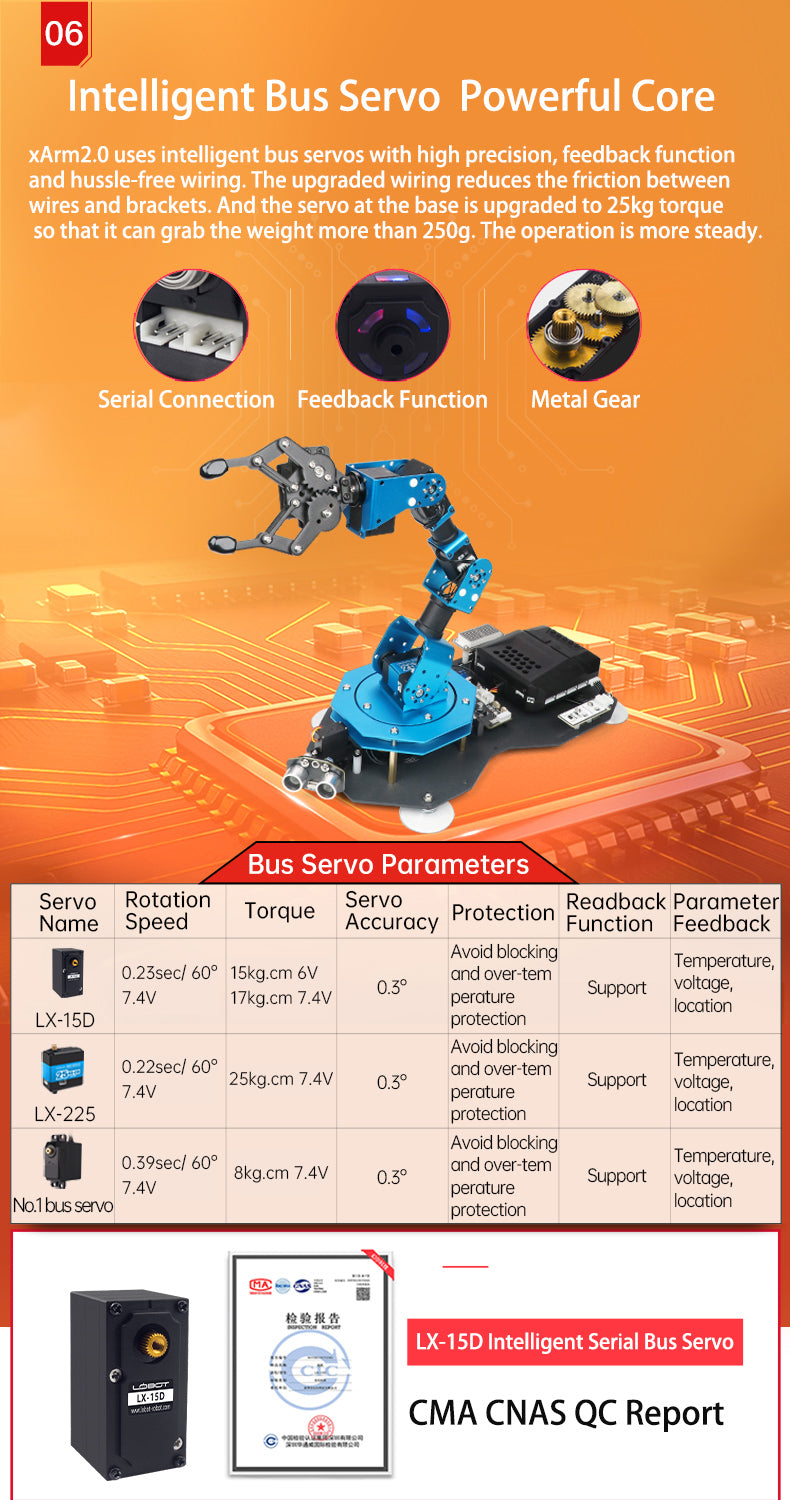 • 強勁的電機:使用串行總線伺服器LX-15D為機械臂供電。全金屬齒輪,高精度進口電位器。伺服支撐角度回讀,電壓反饋,溫度反饋和伺服保護。