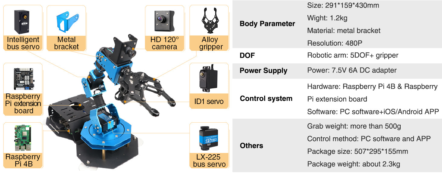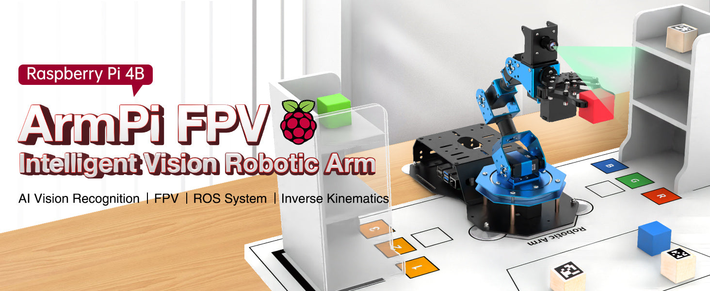 ArmPi FPV 是您使用 Raspbery Pi 4B 控制器開始和繼續冒險所需的一切! 使用OpenCV處理圖像,加載高清120度攝影機,具有ROS操作系統,內置MoveIt,支援Python程式。 提供人臉識別、撿獲等AI視覺遊戲,豪華版本額外提供了語音識別功能,開源供您學習!