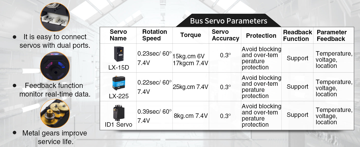 Robot arm uses intelligent serial bus servo with high precision, feedback function and convenient wiring which reduces the friction between wire and brackets. The servo at the base is upgraded to a 25KG torque servo so that ArmPi FPV can grab more than 250g and the movement is more steady.