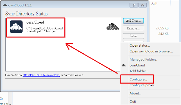 安裝完畢之後,在右下角常駐程式列找出ownCloud。右鍵點擊owncloud圖示後,選擇Configure,然後輸入server IP與使用者名稱及密碼(若已經為user建立帳號,就可以請user輸入個人的帳號開始進行資料同步)。